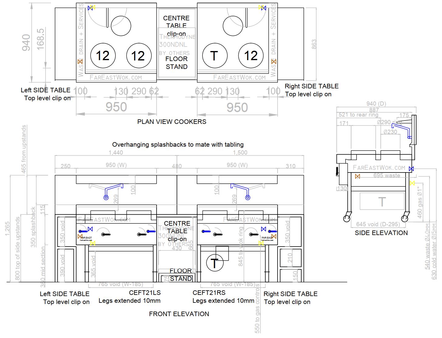 - The suite includes a single turbo burner, and the rear burners have been deleted from the CEFT21 wok cookers. The legs were made 10mm taller to accomodate a grease trap underneath.