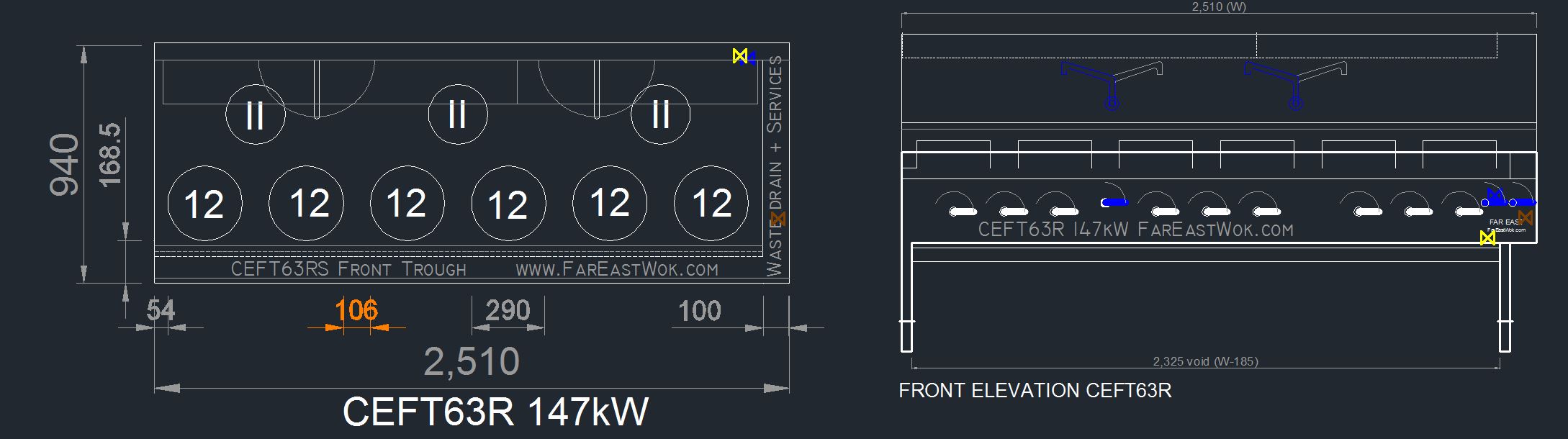 Responding to specifications from a design house on behalf of a Thai restaurant chain, Far East created this custom CEFT63 wok cooker. The brief was to fit 6 main burners within a single 2.5m wok range, getting more burners into a smaller footprint was achieved by reducing the spacing between the main wok burners from 155mm to 106mm (the restaurant doesn’t use larger woks), and spacing from the outside edges by 25mm, resulting in a finished width of 2510mm. Because of the front-mounted lever water tap controls the maximum amount of rear burners is 4 rather than the 5 that might be expected, although the end user only requested 3.
