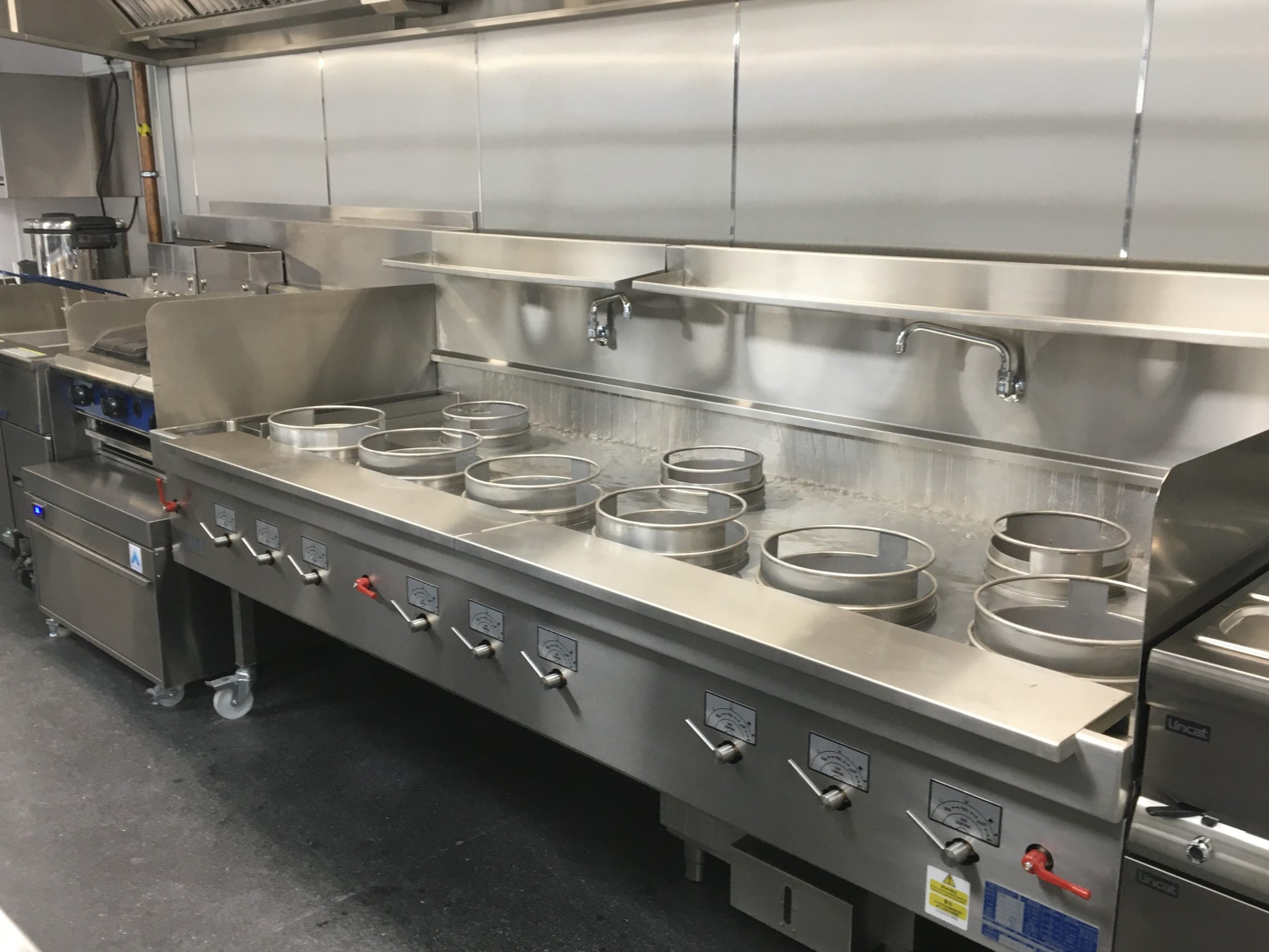 • a special made narrow wok cooker without front trough and the waste box and filter basket moved to the rear to further reduce the width (6 front burners and 3 rear burners within a 2400mm width), this is for a Thai restaurant chain